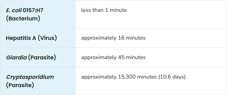 - Times based on 1 ppm free chlorine at pH 7.5 and 77°F (25°C).