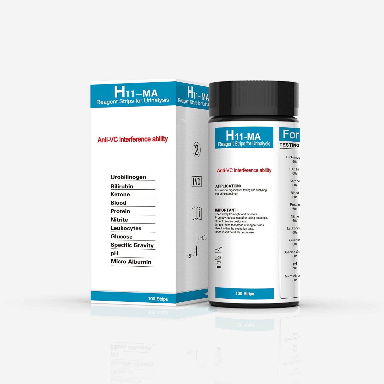 • Test items: Leukocytes, Nitrite, Urobilinogen, Protein, pH, Blood, Specific Gravity, Ketone, Bilirubin, Glucose, Ascorbate